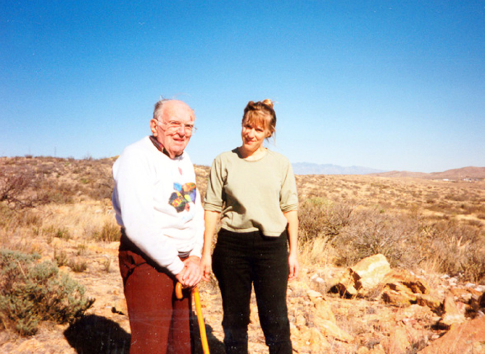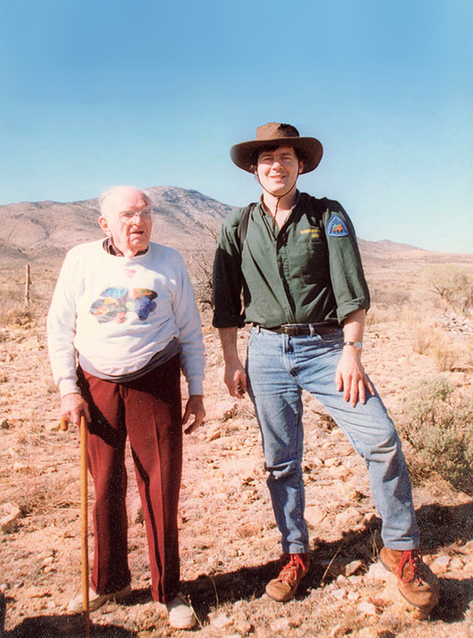 | The late Tom Warren, founder and former president of UltraViolet Products (UVP). He was "The Father of UV Mineral Collecting" and inventor of the world's first portable UV field lamps and me. Near Benson, Arizona, 1994. He was 91. |