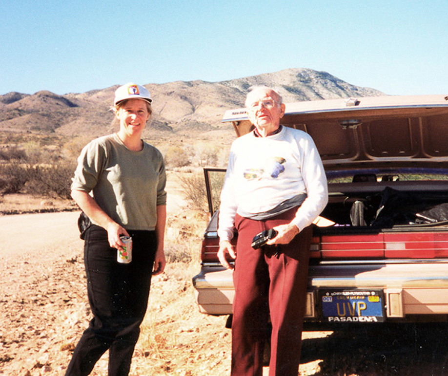 | The late Tom Warren, founder and former president of UltraViolet Products (UVP). He was "The Father of UV Mineral Collecting" and inventor of the world's first portable UV field lamps and me. Near Benson, Arizona, 1994. He was 91. |